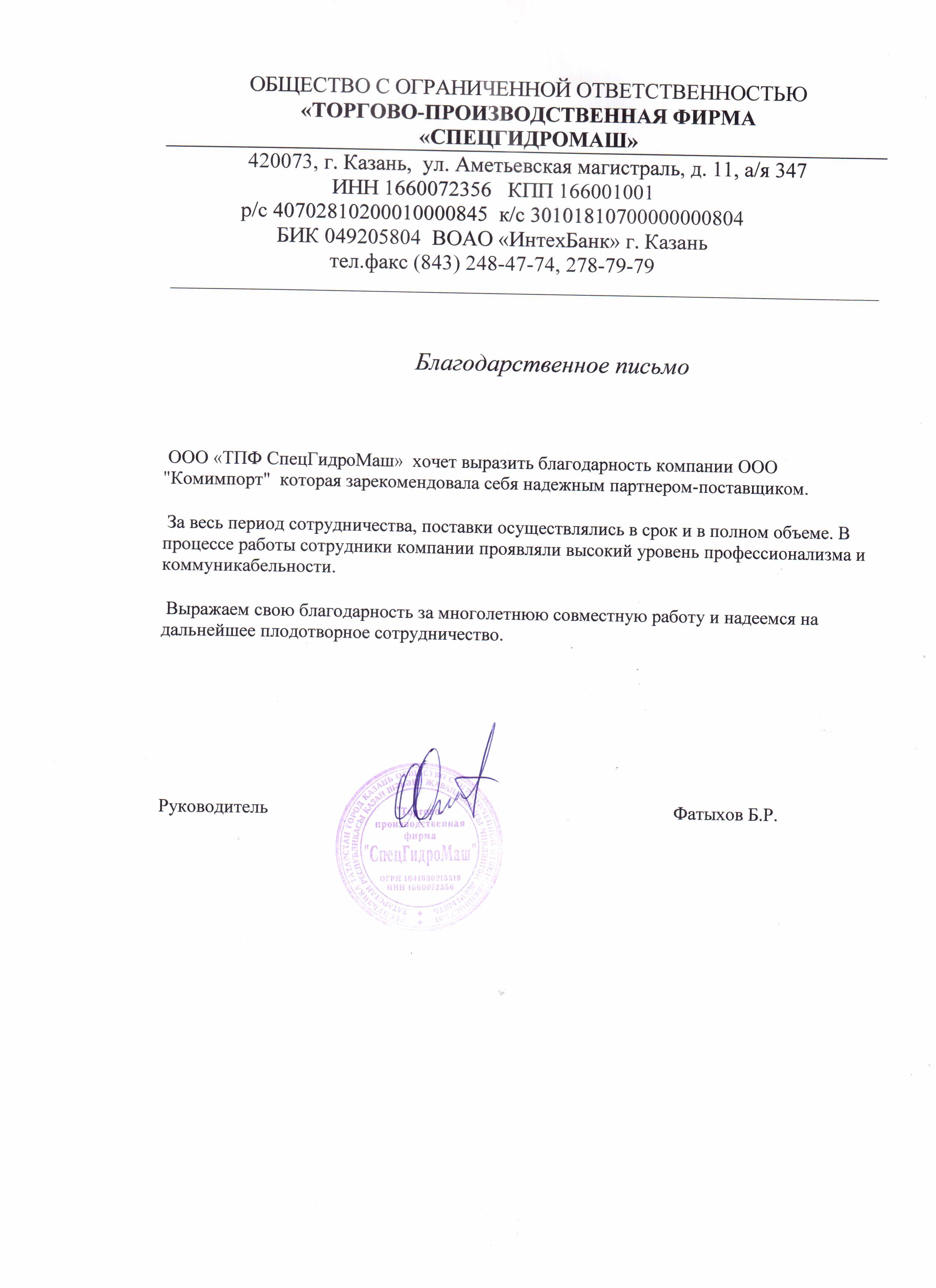 Настоящим письмом выражаем благодарность компании ООО «Комимпорт» за своевременное соблюдение сроков поставки запчастей, обладающих большим опытом и высоким профессионализмом в своей области. Особенно хотелось бы отметить высокое качество запчастей, которое на протяжении всего периода эксплуатации зарекомендовало себя с лучше стороны.